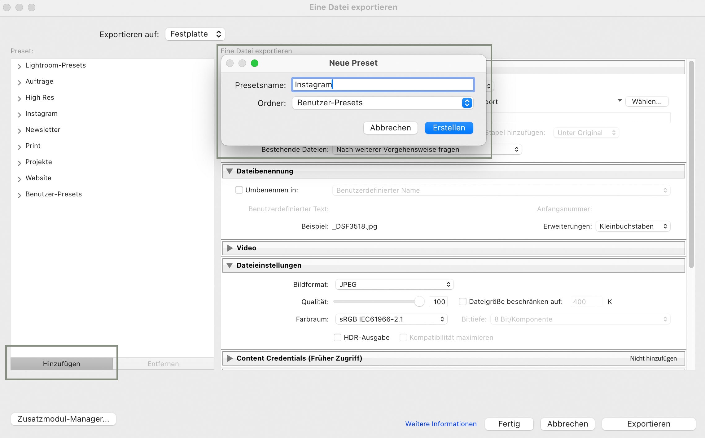 In Lightroom Classic kannst du diese Einstellungen für Instagram als Export-Preset speichern – das spart dir sehr viel Zeit und Nerven. Gehe dazu auf „Hinzufügen“, gebe einen Namen für das Preset ein und gehe dann auf „Erstellen“.